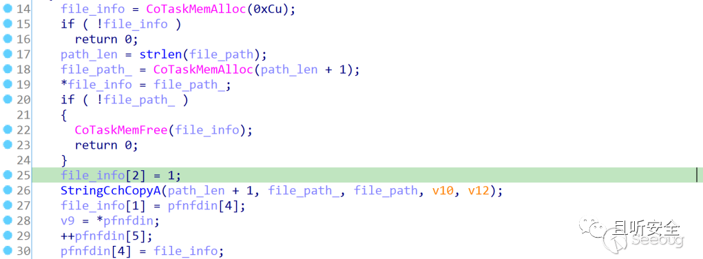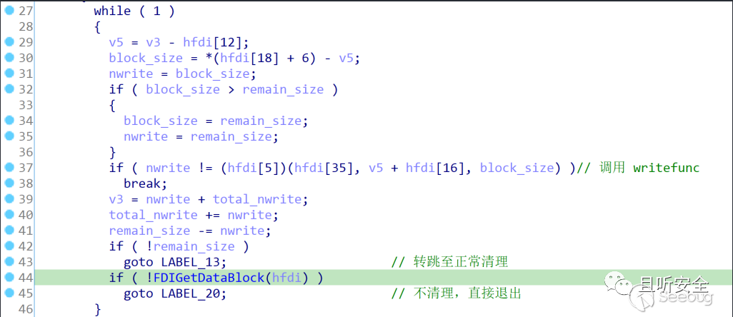 調用fdiNotifyExtract函數父函數是Cabinet!FDIGetFile,我們仔細看一下FDIGetFile中的處理流程(如下圖),就是循環調用FDIGetDataBlock來讀取inf文件的數據,并調用urlmon!writefunc函數將數據逐塊寫入文件。這里如果文件大小正常,則最后一次循環后將轉跳至LABEL_13調用fdiNotifyExtract,且type就是fdintCLOSE_FILE_INFO,因此文件會被刪除。由于攻擊者偽造了文件大小,導致remain_size超出了文件的正常大小,最終導致FDIGetDataBlock異常并返回0,后面就轉跳至LABEL_20調用urlmon!closefunc并返回了: