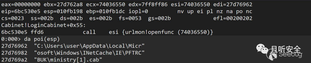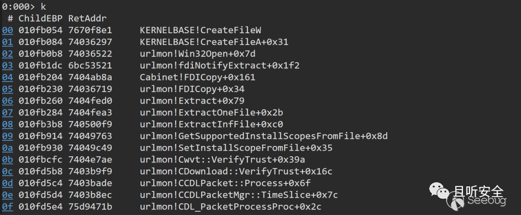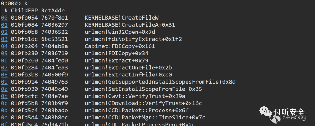 我重點關注的是CreateFileW創建inf文件的地方,cabinet模塊回調了urlmon中的fdiNotifyExtract函數: