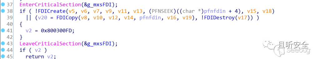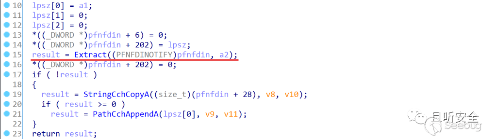 從上圖可以看到,該函數先調用了一次Extract,如果成功了才會開始解壓inf文件,我可以簡單跟進去看一下這個Extract(其實后面還會再次調用Extract函數),內部主要的功能是順序調用FDICreate、FDICopy和FDIDestroy,如果任何一個函數失敗或異常則返回錯誤號,否則返回0: