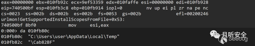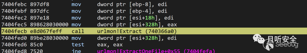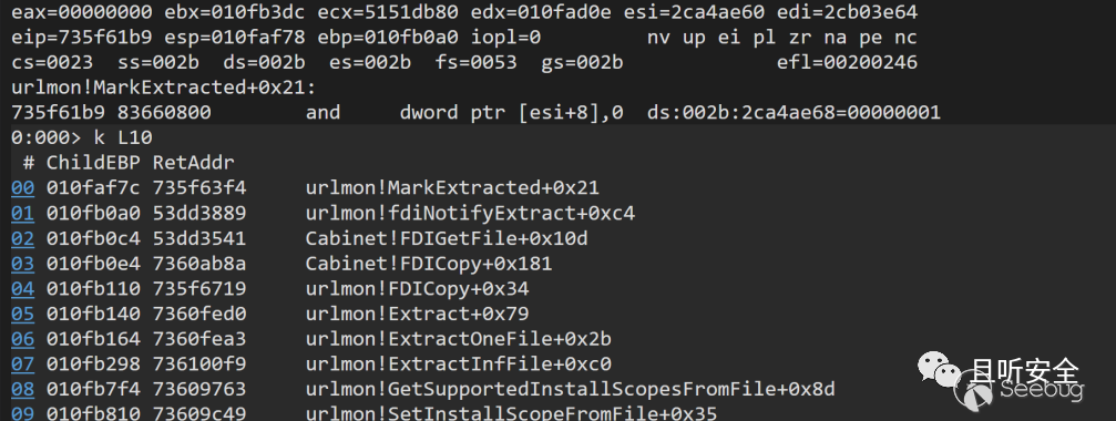 我們通過內存斷點看一下這個file_info[2]到底是在哪里賦值的,通過斷點我們發現該位置是在urlmon!AddFile函數被賦值為1的,然而后面直到DeleteExtractedFiles函數,該位置始終沒有被清空,因此inf文件得以保留: