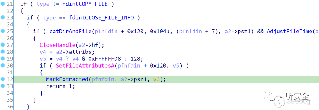 從fdiNotifyExtract函數中可以看到,當調用參數type為fdintCLOSE_FILE_INFO(值為3)時,才可能調用MarkExtracted:
