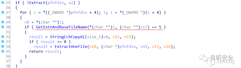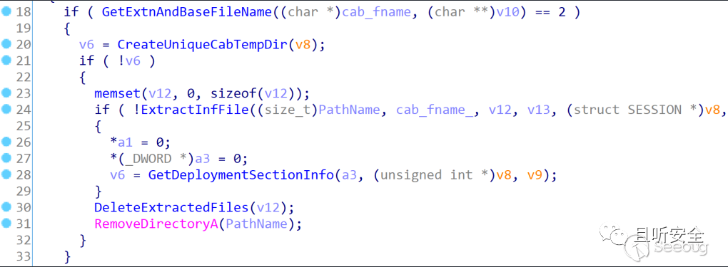 如果臨時目錄創建成功,則通過ExtractInfFile(如下圖)來解壓cab包中的inf類型的文件(注意,這個函數只會解壓后綴是inf的文件),從IDA中可以看到調用GetExtnAndBaseFileName后需要返回值為5(參考前面的圖,當后綴為inf時返回5),因此該函數只會解壓后綴是inf的文件,最終調用ExtractOneFile來實現解壓功能(注意,如果cab中有多個inf文件,則只會解壓第一個遇到的):