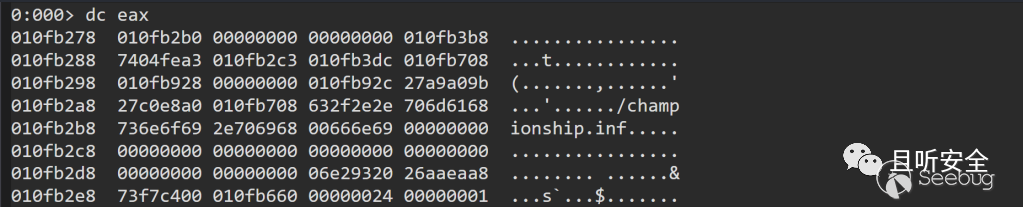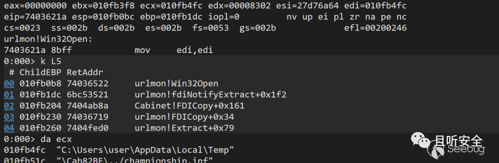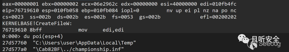 既然我們基本知道了漏洞樣本的執行流程,那么能想到就是掛上調試器在感興趣的地方下斷點,第一個斷點嘗試下在kernelbase!CreateFileW,找到創建championship.inf文件的地方(由于調用CreateFileW的地方會比較多,這里建議可以設置個條件斷點,比如判斷文件名參數poi(esp+4)+xx地方的值是0x6e0066,即文件后綴為".inf"):