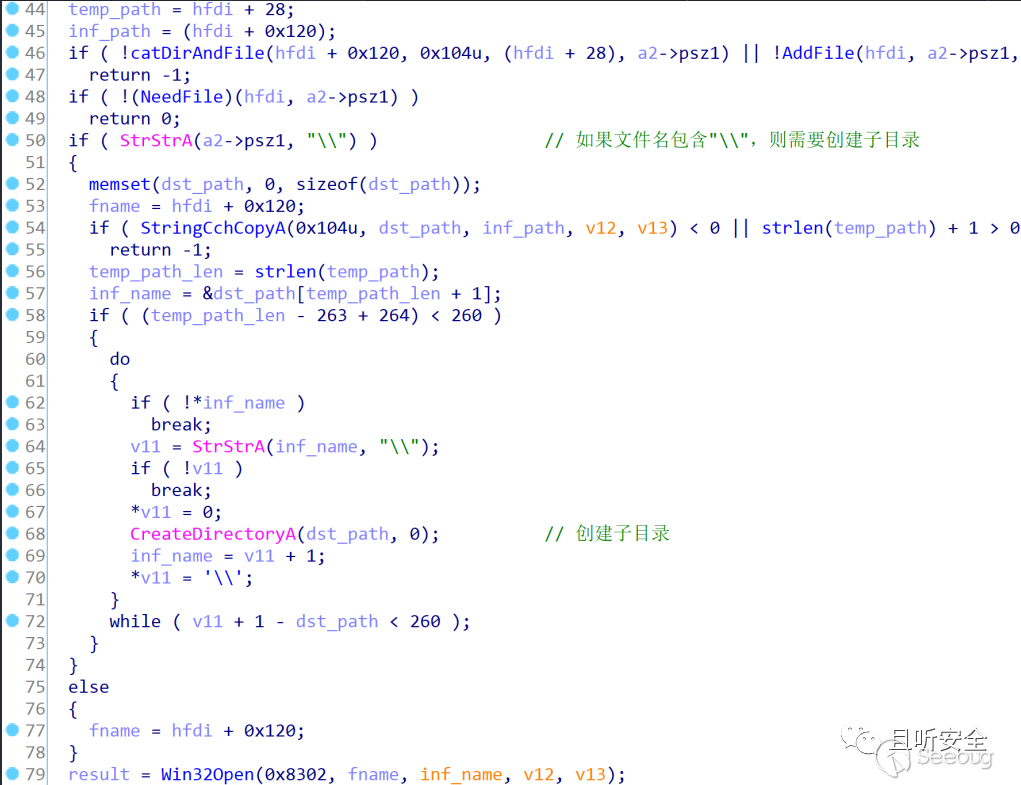 現在進入fdiNotifyExtract函數,可以看到前面分別調用了catDirAndFile、AddFile和NeedFile,如果都能成功則最后調用Win32Open來創建inf文件(終于找到關鍵點了):