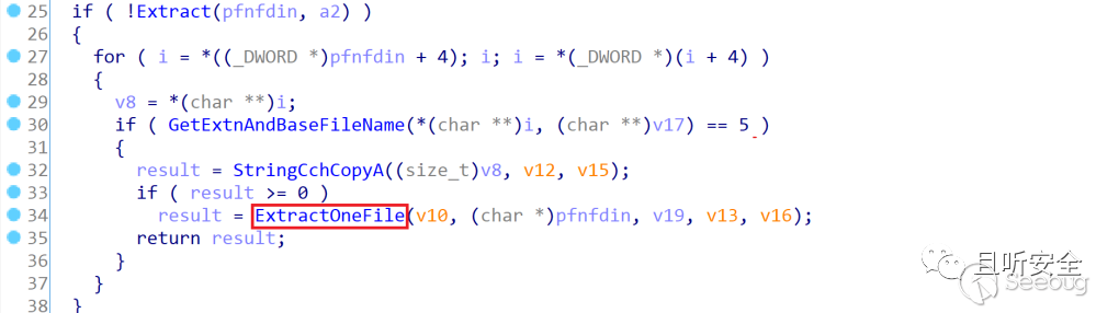 cabinet.dll我們先不跟進去,還是回到urlmon.dll的ExtractInfFile函數中,程序通過一個循環來遍歷cab包中的文件,如果發現后綴為inf的文件,則會調用ExtractOneFile函數來解壓inf文件,并退出函數: