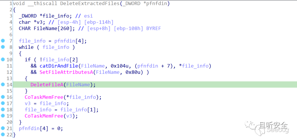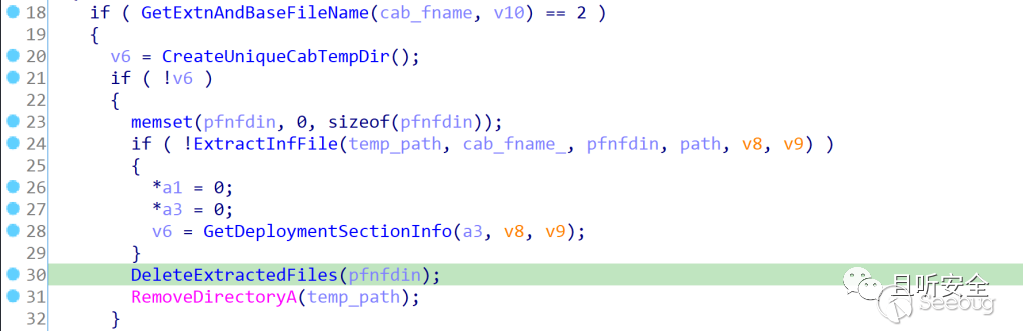 到這還沒結束,大家可能還記得,我們在復現漏洞的時候發現釋放的inf文件很快就會被刪除,導致后面無法實現代碼執行,我們繼續往后走來一探究竟。創建完inf文件后,我們回到urlmon中的GetSupportedInstallScopesFromFile函數,它會立即調用DeleteExtractedFiles函數來刪除解壓出來的文件: