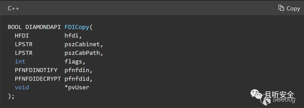 現在我們再次進入這個Extract函數,跟進cabinet模塊中的FDICopy看看,下圖是該函數的定義: