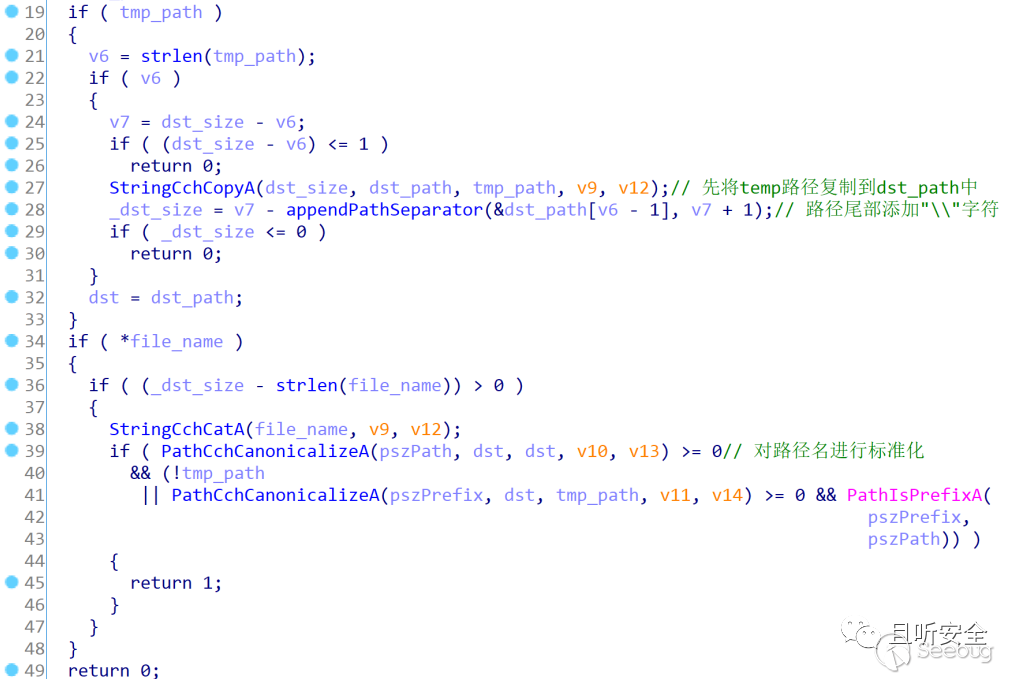先來看catDirAndFile函數,主要是會調用PathCchCanonicalizeA對路徑進行一系列的處理(流程比較復雜,看著頭暈,有興趣的可以自己去逆一下,說不定能找到什么別的問題),幸運的是并不會對"../"進行過濾: