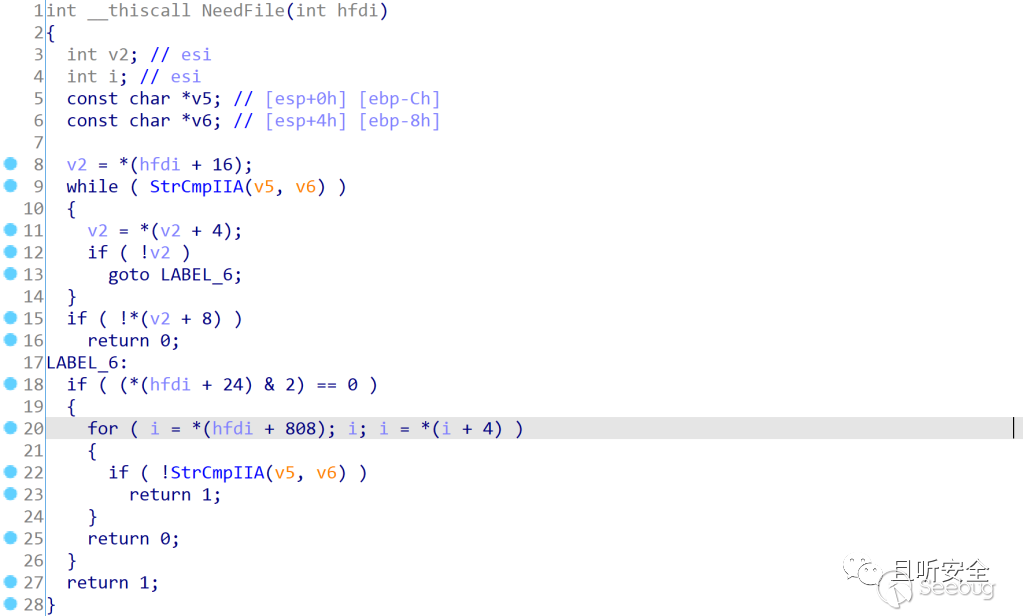 而NeedFile功能比較簡單,主要是判斷文件名是否一致,還有一個關鍵點是hfdi+808這個地方必須有數據(在ExtractOneFile函數中,該位置被正常賦值了,因此能夠通過驗證):