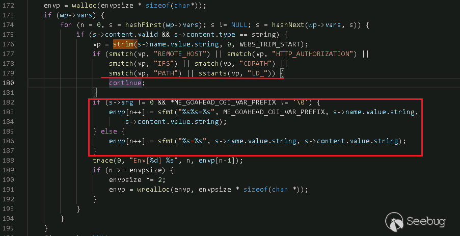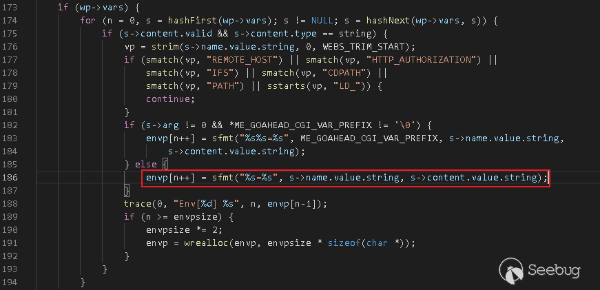 vp將永遠為0,所以上面通過if過濾LD_PRELOAD參數的過程是沒有任何意義的。接著往下走,GoAhead會將POST請求的表單變量使用ME_GOAHEAD_CGI_VAR_PREFIX作為前綴,通過函數sfmt進行字符串格式化以保證LD_PRELOAD不會被劫持。看起來修復的很完善,但是我們看這里進入第183行處理的前提條件是s->arg的值不為0(初始化狀態為0)。