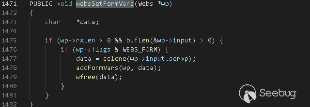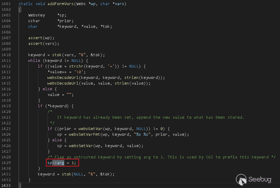 這2個函數都調用了addFormVars,在前面對CVE-2017-17562漏洞補丁進行分析的過程中提到過這個函數,addFormVars處理的最后將sp->arg賦值為1,使得cgi.c#cgiHandler處理過程中會對請求參數進行重命名,從而修復了CVE-2017-17562漏洞。