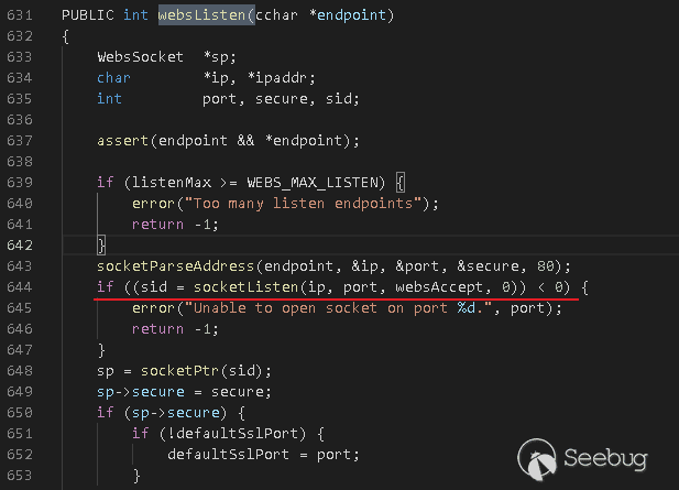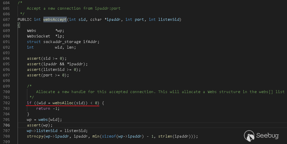 第644行定義了當有HTTP請求來到時,將回調websAccept函數進行處理。