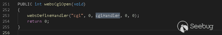 websDefineHandler函數用來定義處理不同請求類型的回調函數,比如上面定義CGI的回調處理函數為cgiHandler,前面補丁對比分析時講過這個函數會對參數進行加前綴處理。