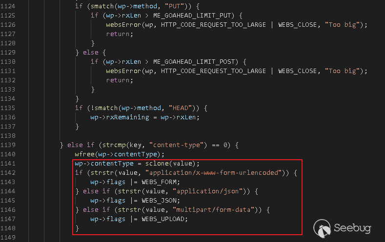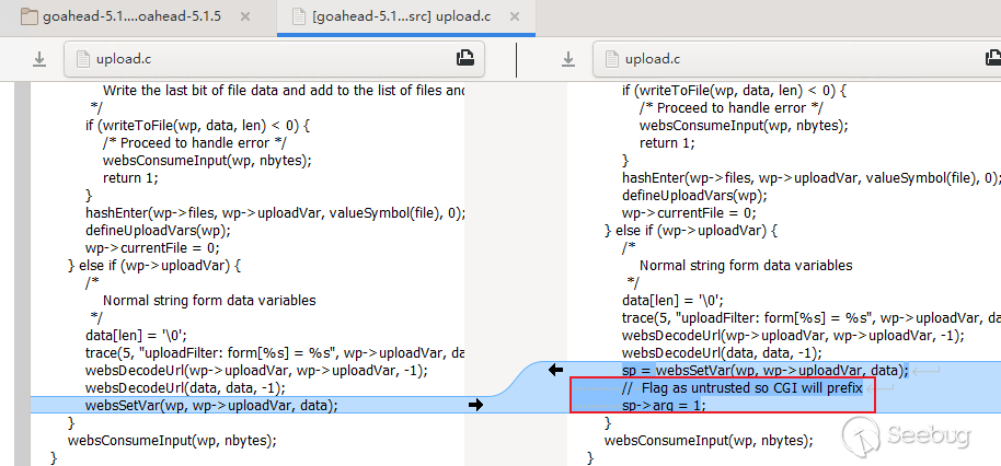 在WEBS_READY提到,GoAhead對POST請求和GET請求提交的參數都會調用addFormVars函數進行處理,將sp->arg賦值為1,從而使得cgi.c#cgiHandler重命名環境變量,但是我們可以看到POST請求調用addFormVars的前提是wp-flags取值為WEB_FORM,回顧WEBS_BEGIN處理過程,當content-type為multipart/form-data時,wp-flags將賦值為WEBS_UPLOAD,也就是說,如果HTTP請求為文件上傳類型時,參數將不會通過addFormVars處理,此時s->arg取值仍然為0,從而在cgi.c#cgiHandler中將進入如下分支:
