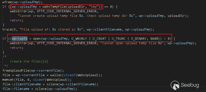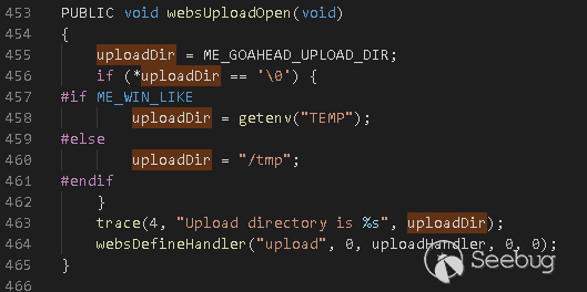 這里重點講下文件上傳狀態WEBS_UPLOAD參數處理的過程。在upload.c中,默認定義上傳文件保存目錄為tmp: