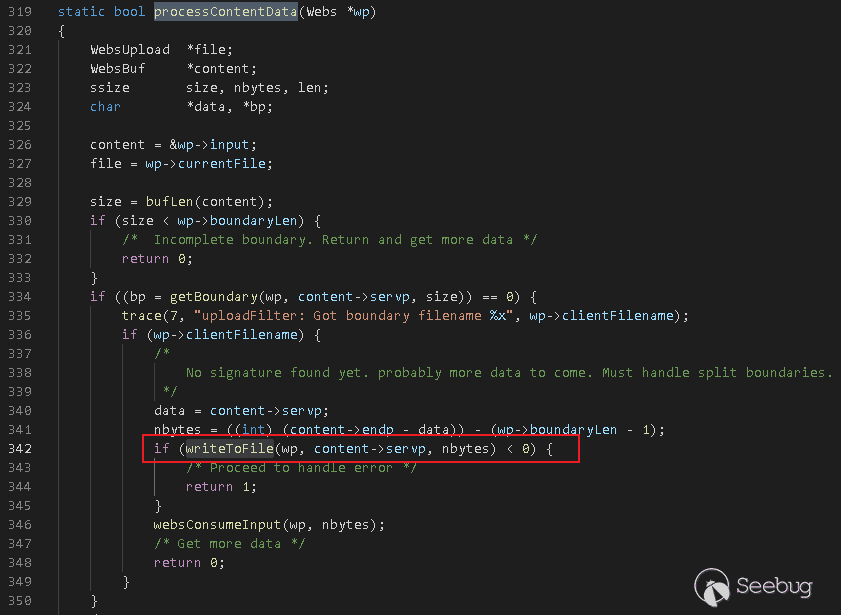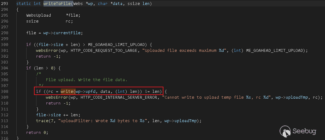 因此,websTempFile默認將生成一個/tmp/tmp-0.tmp的臨時文件名稱,數字是websTempFile中根據count++生成的。然后打開臨時文件,并將文件句柄賦值給wp->upfd。在processContentData處理上傳文件時,將調用writeToFile寫入文件: