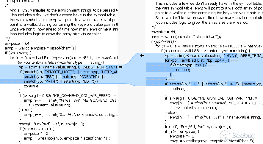 在開始真正漏洞分析之前,我們首先回顧一下GoAhead針對CVE-2017-17562的修復方式。主要修復有2個。第1個在cgi.c#cgiHandler處理函數中: