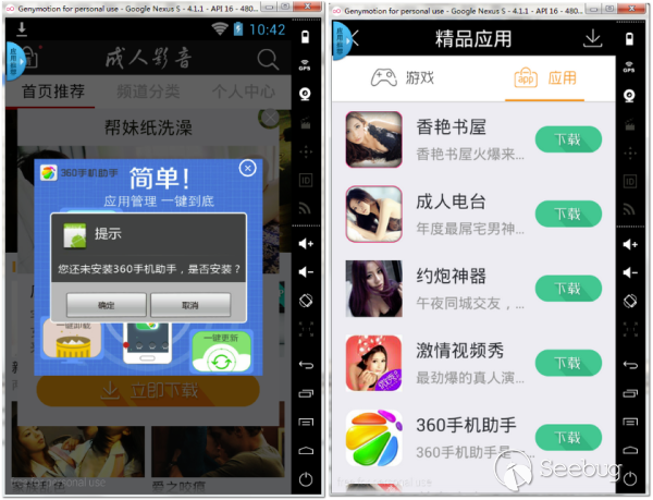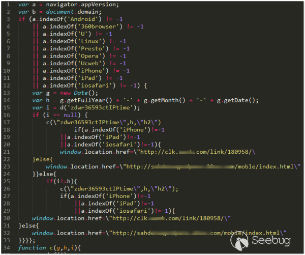去年我們曾多次接到用戶反饋使用手機瀏覽器打開網頁時經常被跳轉到色情推廣頁面,經過抓包分析,發現是由于百度網盟CDN緩存服務器中的關鍵JS文件被污染注入廣告代碼,劫持代碼根據user-agent頭判斷流量來源后針對PC、Android、iOS等平臺進行分流彈窗,誘導用戶安裝“偽色播”病毒APP。