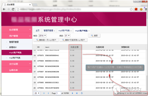 以其中某個專門做“色播誘導”業務的廣告聯盟為例,其背后的推廣渠道多達數百個,每年用于推廣結算的財務流水超過5000w元。從其旗下的某款色播病毒APP的管理后臺來看,短短半年內扣費訂單數據超過100w條,平均每個用戶扣費金額從6~20元不等,拋開其他的流氓推廣收益,僅扣費這一項的半年收益總額就過百萬,而這只是海量“偽色播”病毒樣本中的一個,那整個產業鏈的暴利收益可想而知。