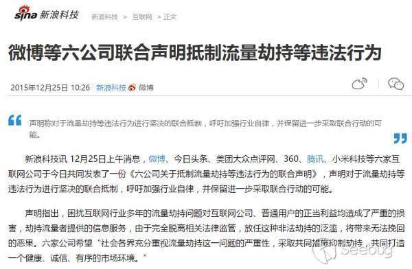 提起網絡劫持,往往第一個想起的就是運營商劫持,可能每一個上網的用戶或多或少都曾經遇到過,電腦系統或手機用安全軟件掃描沒有任何異常,但是打開正常網頁總是莫名其妙彈出廣告或者跳轉到其他網站。對普通用戶來說這樣的行為可以說深惡痛絕,企業和正規網站同樣也深受其害,正常業務和企業形象都會受到影響,在15年年底,騰訊、小米、微博等6家互聯網公司共同發表了一篇抵制運營商流量劫持的聯合聲明。