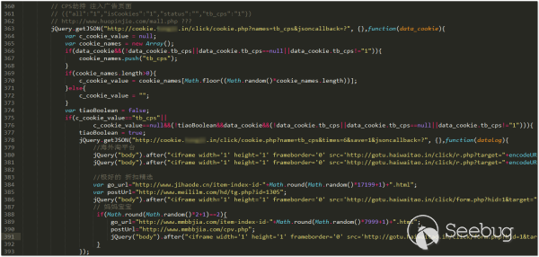 通過注入JS腳本來劫持用戶網頁瀏覽的技術優點也很明顯,一方面注入的云端JS腳本比較靈活,可以隨時在云端控制修改劫持行為,另一方面對于普通用戶來說非常隱蔽,難以察覺。被注入用戶網頁的JS腳本的對網頁瀏覽中大部分的推廣流量都進行了劫持,如下圖: