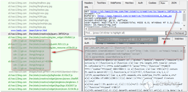 被篡改的惡意DNS會劫持常見導航站的靜態資源域名,例如http://s0.hao123img.com、http://s0.qhimg.com等,劫持者會在網頁引用的jquery庫中注入JS代碼,以實現后續的劫持行為。由于頁面緩存的原因,通過JS緩存投毒還可以實現長期隱蔽劫持。