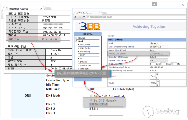 如下圖中漏洞路由器首選DNS被設置為劫持服務器IP,備選DNS服務器設為谷歌公共DNS(8.8.8.8)