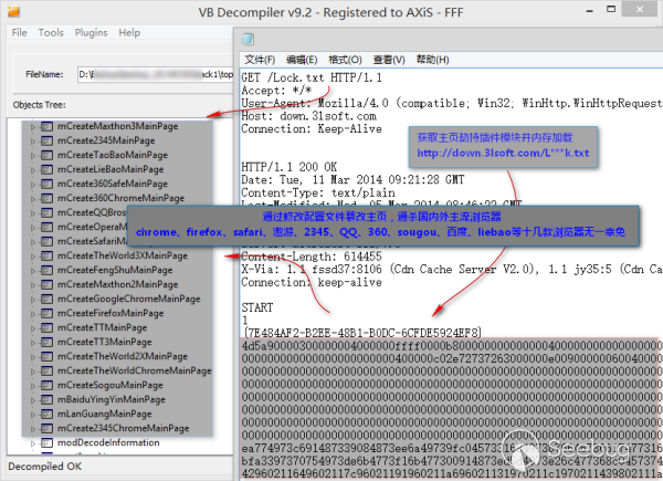 下面講到的案例是我們曾經捕獲到的一批導航主頁劫持樣本,歷史活躍期最早可以追溯到2014年,主要通過多類流氓軟件捆綁傳播,其劫持功能模塊通過聯網更新獲取,經過多層的內存解密后再動態加載。其中的主頁劫持插件模塊通過修改瀏覽器配置文件實現主頁篡改,對國內外的chrome、火狐、safari、傲游、qq、360、搜狗等20余款主流瀏覽器做到了全部覆蓋。實現這些功能顯然需要對這批瀏覽器的配置文件格式和加密算法做逆向分析,在樣本分析過程中我們甚至發現其利用某漏洞繞過了其中2款瀏覽器的主頁保護功能,流氓作者可謂非常“走心”,可惜是劍走偏鋒。