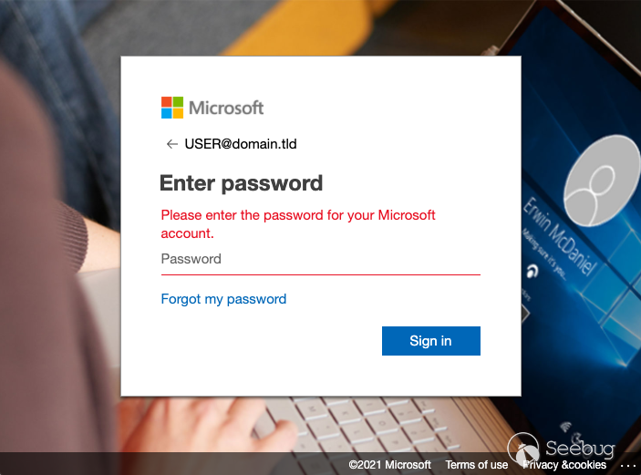 打開附件的 HTML 將顯示一個偽造的帶有公司品牌的微軟365登錄頁。這是對舊版釣魚工具的一個升級,舊版釣魚工具沒有顯示品牌。登錄電子郵件地址是預先填寫的,并與釣魚電子郵件的收件人相匹配。品牌是基于電子郵件地址的域名,直接從微軟365下載。