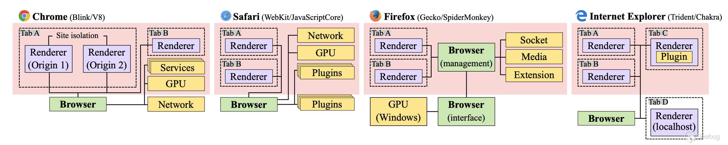 圖1: 四大瀏覽器的內部架構。所有瀏覽器都部署了一個沙箱(粉紅色區域)來限制渲染器,而詳細的沙箱方法因底層操作系統而異。瀏覽器之間存在細微但重要的差異。