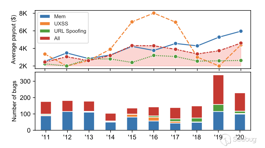 漏洞賞金計劃: 谷歌等主流瀏覽器廠商為那些幫助他們修復漏洞的安全錯誤報告提供獎勵[116]。在大多數情況下,這些賞金考慮了多種因素,例如漏洞類型、可利用性以及報告者所做的額外有意義的工作。更高的賞金更能激勵研究員和白帽去發掘漏洞。我們在圖6中將每年的平均支付金額與Chromium中每年的漏洞數量相關聯。我們特別展示了內存安全、UXSS和URL欺騙漏洞,因為它們與支付金額的關聯模式很有意思。