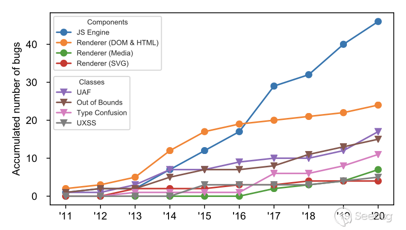 圖7. 被利用的瀏覽器組件和錯誤類別的趨勢. 數據包括來自所有瀏覽器的錯誤. 線上是累積的數量. JavaScript引擎和UAF錯誤分別主導了被利用的bug組件和漏洞類型。