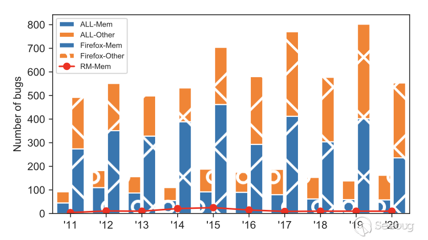 圖5. Firefox和其他瀏覽器中內存安全漏洞與其他漏洞的數量。RM-Mem是Firefox渲染器中媒體解析組件中內存安全漏洞的數量,描述了從2015年開始用Rust部分重寫后的下降趨勢。