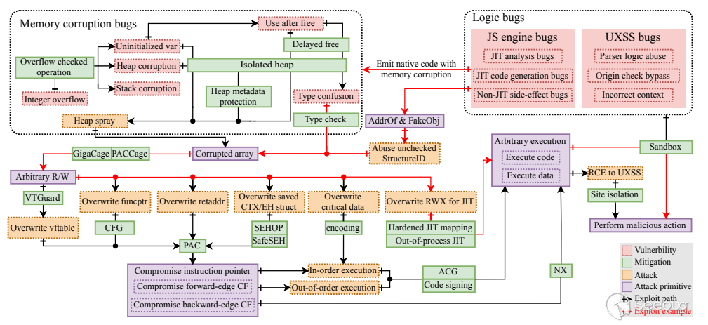 圖2. 瀏覽器利用場景和漏洞分類。我們主要關注瀏覽器安全相關問題,省略了基本的軟件攻擊/防御技術,如ROP、NX和ASLR。"Exploit example"箭頭描繪了§V中描述的利用路徑。