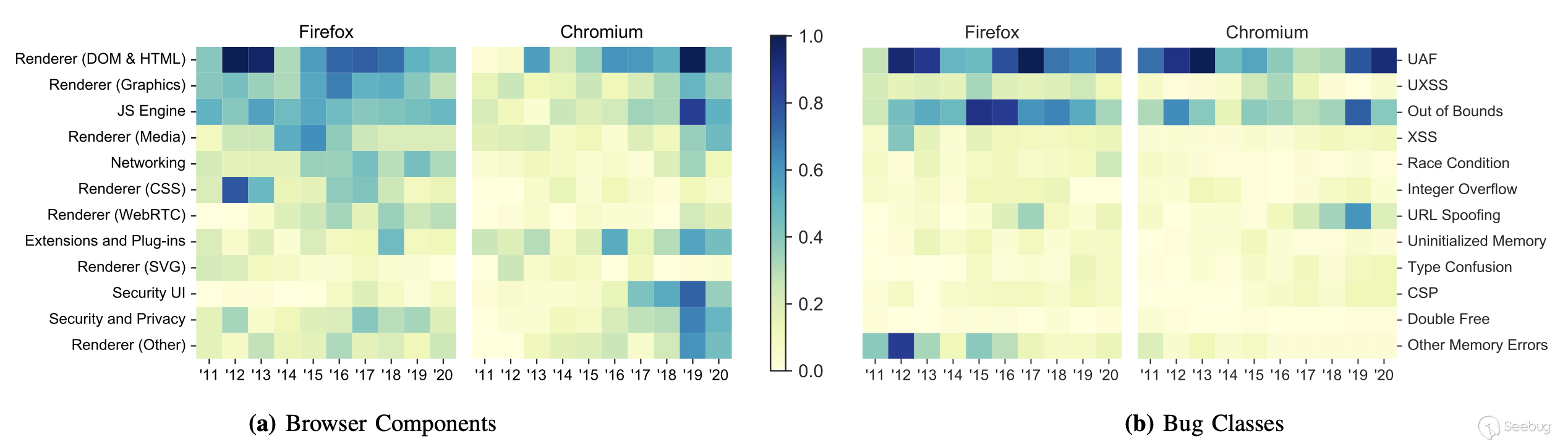 圖4. 將bug映射到Firefox和Chromium中的主機瀏覽器組件和漏洞類. 該圖突出了瀏覽器攻擊面逐年變化的性質. 每個圖中的數字都是按最小-最大比例縮放的.