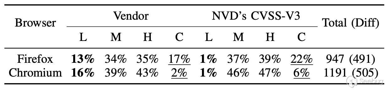漏洞嚴重性評級的分歧: 通用漏洞評分系統(CVSS)[46]是作為漏洞嚴重性評估的免費和開源標準而開發的。 National Vulnerability Database[55]使用CVSS標準為每個發布的CVE編號提供漏洞嚴重性基礎評分。同樣,Firefox和Chromium在其bug跟蹤器[43][48]和安全建議[53]中提供了對漏洞嚴重性的評估,使用的是他們自己的漏洞評級系統。表III比較了NVD的CVSS-V3與Firefox和Chromium的漏洞嚴重性評估。本研究的目的是衡量使用NVD的CVSS-V3分數作為瀏覽器中漏洞嚴重程度的統一度量的有效性。