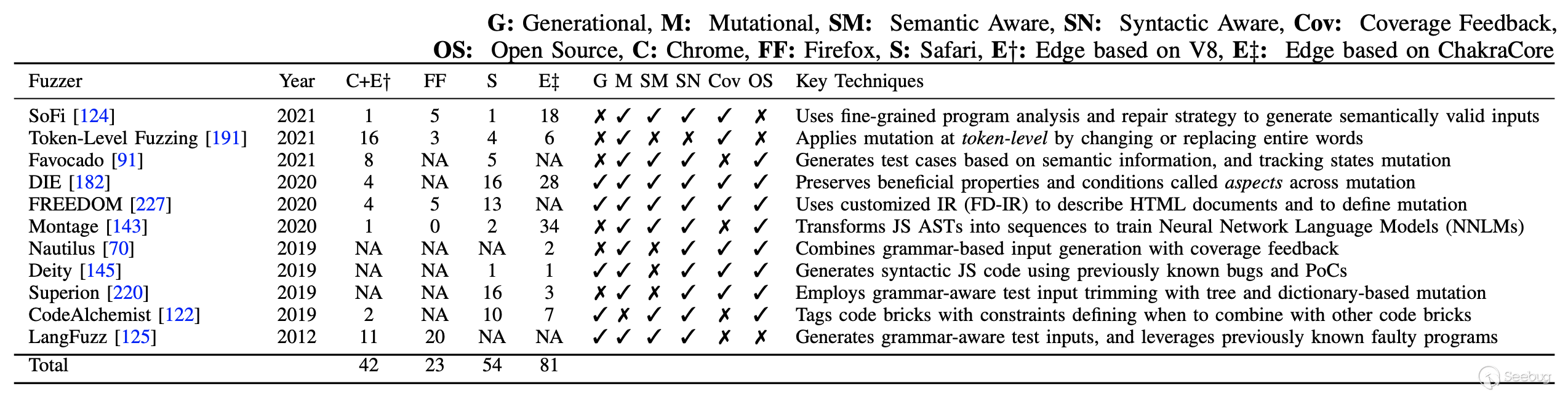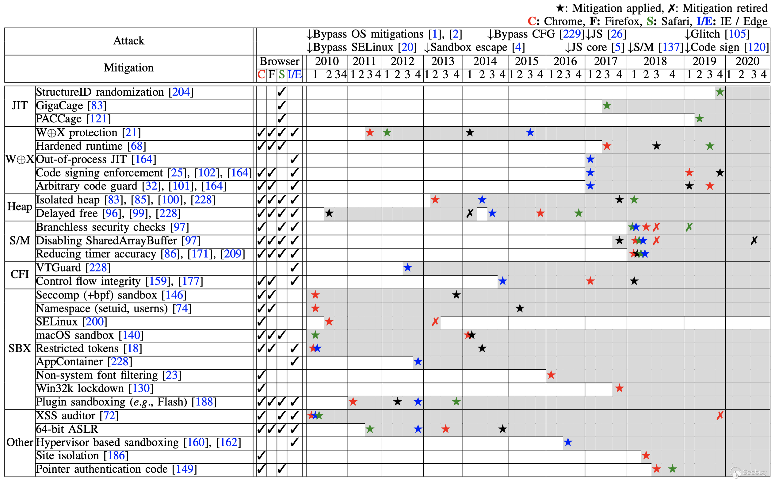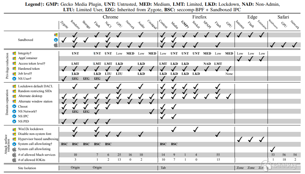 表I. 沙盒對比(Chrome, Firefox, Edge, Safari; on Windows, Linux, MacOS)