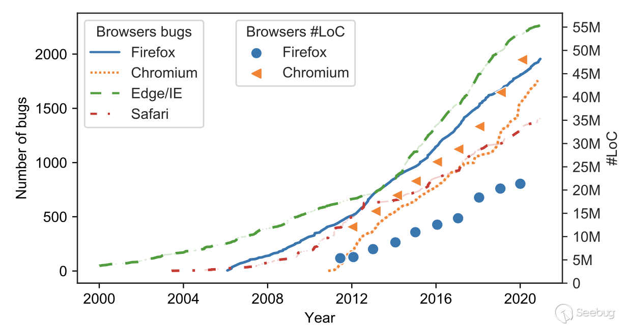 圖3. 左y軸: 安全漏洞數量; 右y軸: 兩個開源瀏覽器(Firefox和Chromium)的LoC. LoC是基于每年的首個主要版本更新.