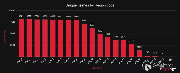 每個 PrivateLoader 示例嵌入一個區域代碼,該區域代碼與自動程序的 c2服務器和國家進行通信。下面的圖表顯示了在覆蓋期間每個區域代碼下載的唯一散列數。我們認為,這些區域代碼中的“ WW”前綴代表“世界范圍”,因為它于樣本中經常出現。在面板方面,我們懷疑這段代碼代表了前面表中描述的“link_geo”參數。