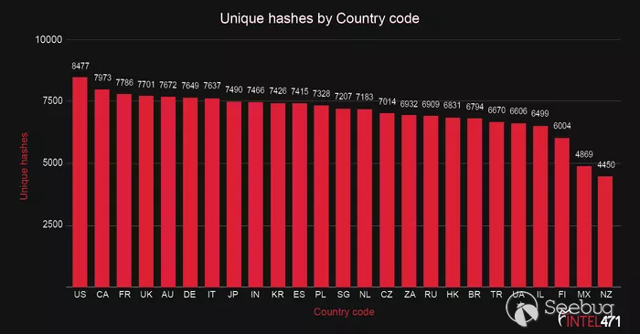 然而,當我們通過自動程序的國家代碼查詢唯一散列的數量時,我們觀察到了一個與上圖不同的分布(見下圖)。這不難猜到,因為流行的世界各地的區域代碼封裝多個國家。