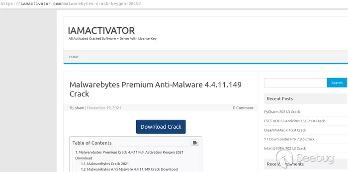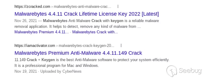 例如,搜索“ Malwarebytes crack”會出現以下網站,位列第四和第五個結果: