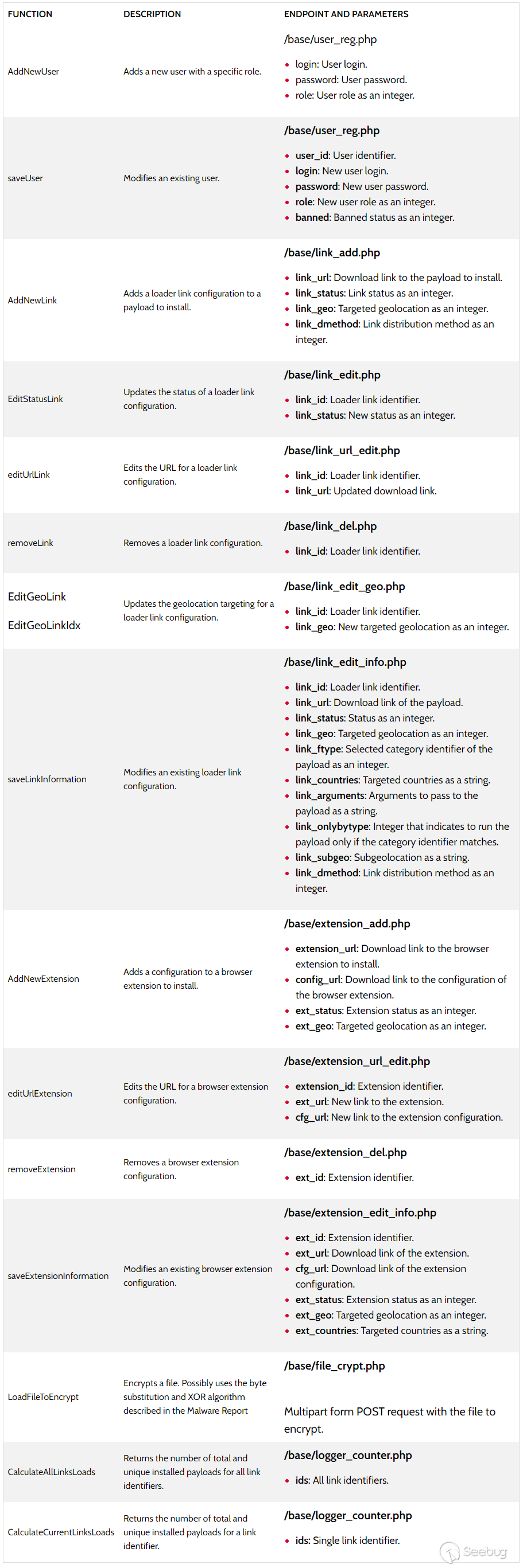 使用 Javascript 庫 app.js 的前端腳本似乎公開了提供給面板用戶的功能。下面的表格描述了腳本中有趣的 JavaScript 函數: