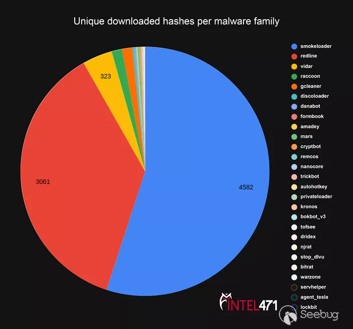 下面的圖表顯示了我們的惡意軟件情報系統檢測到的PrivateLoader為每個惡意軟件下載的唯一散列數量。這項 PPI 服務最多的惡意軟件是 Smokeloader、 Redline 和 Vidar: