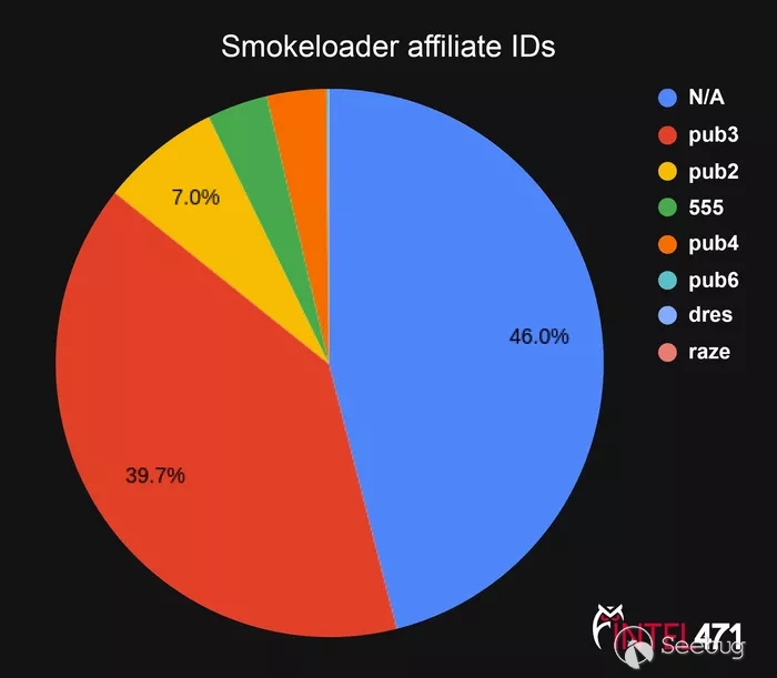 在我們看到的由 PrivateLoader 推動的有效載荷中,最常見的是 Smokeloader。下面的圖表顯示了從我們的惡意軟件情報系統檢測到的所有單獨的 Smokeloader 樣本中提取的附屬 id (或缺少的) :
