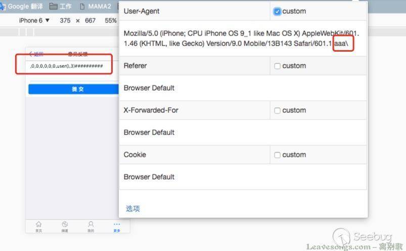 所以,我最后得到的payload如下:,0,0,0,0,0,0,user(),3)##########,再將UA最后一位設置為\,如下圖: