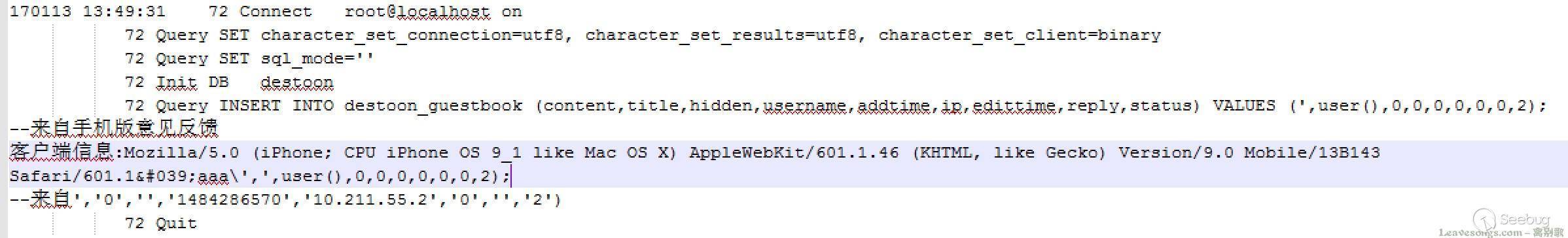 而據我對destoon的了解,其全局對GPC做了轉義和WAF,但User-Agent沒有進行過濾,所以這里有可能存在一個SQL注入漏洞。