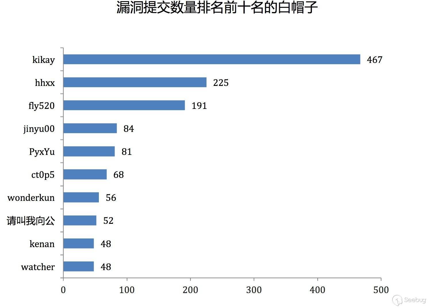 在2016年收錄的4983個漏洞中,有以下十位白帽子提供了大量的漏洞資料,其中提交漏洞數最多的是kikay,提交并被收錄漏洞達到467個之多。