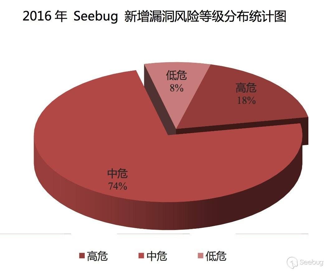 Seebug根據漏洞的利用復雜程度、影響范圍等將危害分為三個等級,即高危、中危、低危。2016年新增漏洞危害等級分布如圖所示,其中高危漏洞419個(占18%),中危漏洞1748個(占74%), 低危漏洞183個(占8%)。高危漏洞中有我們熟知的DirtyCOW漏洞(CVE-2016-5195)、OpenSSH遠程代碼執行漏洞(CVE-2016-10010)、Nginx權限提升(CVE-2016-1247)、win32k權限提升漏洞(CVE-2016-7255)等,多數為各大主流操作系統漏洞。