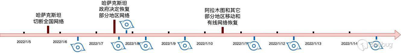 根據ZoomEye網絡空間搜索引擎的探測結果,2022年1月5日16時開始,僅能探測到極少量哈薩克斯坦主機。該時間略早于新聞報道的中所述的2022年1月5日晚。